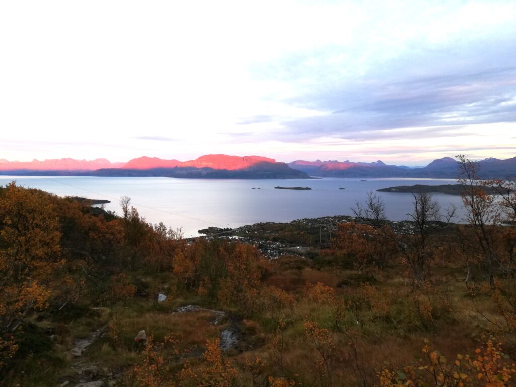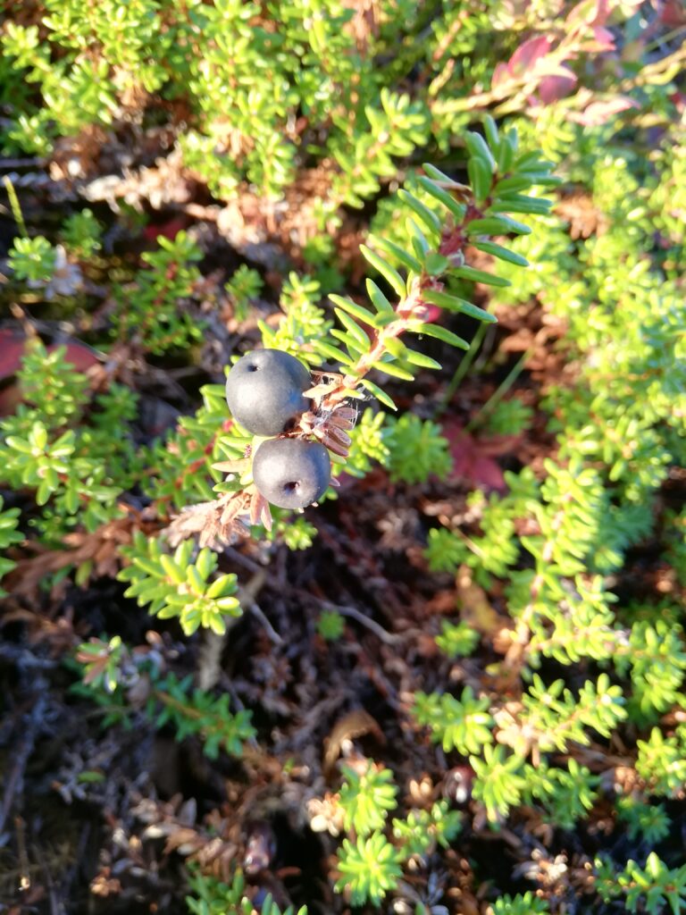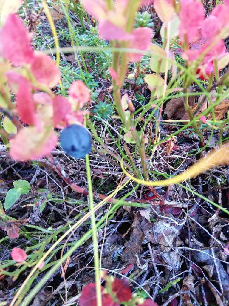 Den Boden fühlen. Sich auf die Knie begeben. An der Erde lauschen. Dort sind noch einige Blaubeeren versteckt und laden zum Moment der Ruhe ein. Dazwischen Krähenbeeren, die Durstlöscher. Die Wanderung möchte gar nicht enden. – Es dämmert, aber ich steige nochmal hinauf zum Pevatnet. Das Dunkel nimmt mich auf, und der Weg ist mir schon etwas vertraut. Ich fühle wärmere und kühlere Stellen.