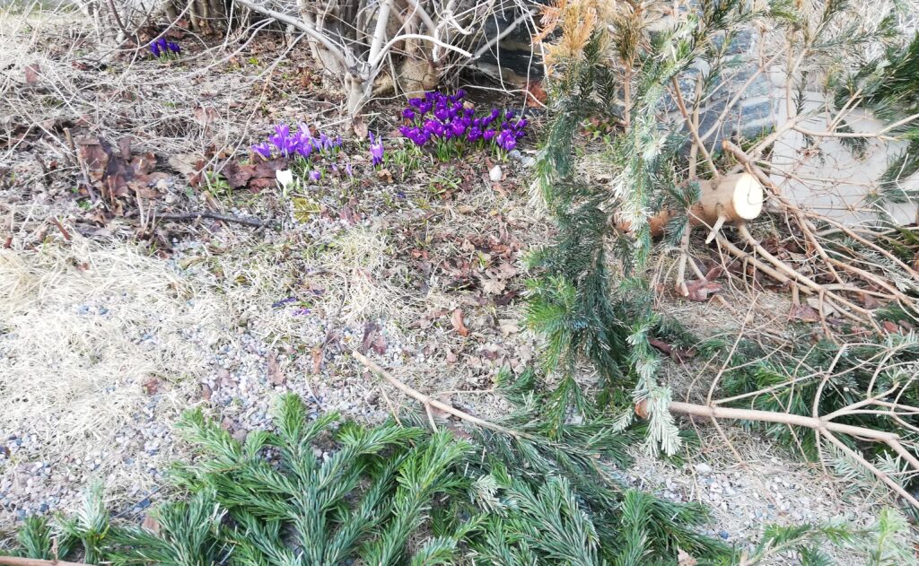 An der Kirchentür blühen etwas versteckt hinter dem noch herumliegenden abgeschnittenen unteren Kranz des Weihnachtsbaumes die Krokusse.